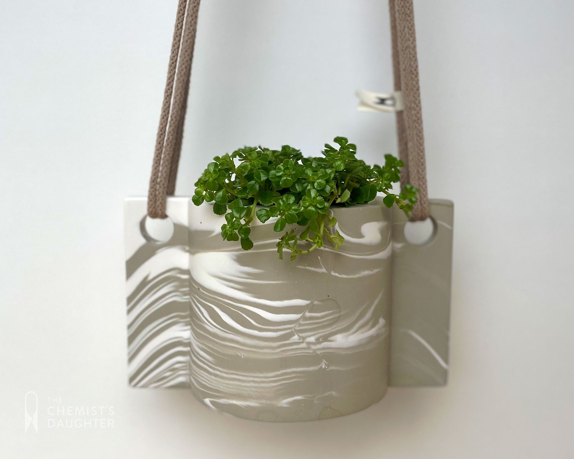 A modern style plant pot holder that can hang, or sit on a surface due to the removable rope, in a marble of off-white and stone colours.